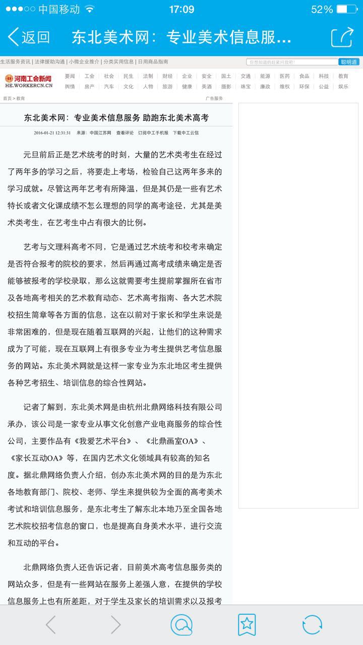 东北美术网 (http://www.dongbeims.com)的即将上线,将对东北地区的美术教育机构与美术爱好者给予帮助,记者从东北美术网上了解到,目前网站提供的服务信息有院校专栏、高考专栏、美考政策、培训教程等几大栏目,分别从院校招考信息、高考作品交流、美考相关政策、美学教学培训等几方面给予东北本地考生以专业性的帮助,尤其是教学培训是一大亮点。网站精选了来自全国比较知名的美术教师的精彩讲课资料,以视频和图文的形式表现出来,并且提供了在高考中表现比较好的案例进行解读,让考生们对高考有了一个直观的了解,从而在今后的考试过程中做到胸有成竹,更好的应对高考这一人生中具有重大意义的考试。